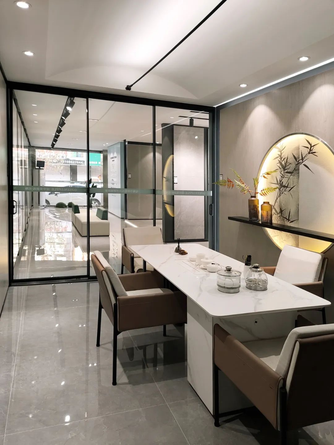 選材區與模擬間采用開放式設計,減去墻面的阻隔,空間實現無縫銜接。設計師運用現代設計手法,為每一個空間注入時尚之美,帶來極強的感官享受,給消費者一種沉浸式的購磚體驗。